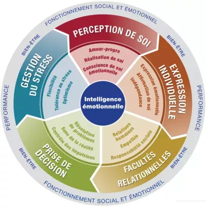 Le fonctionnement émotionnel apparaît par le biais de quinze compétences regroupées en cinq échelles: la perception de soi, l'expression individuelle, les facultés relationnelles, la prise de décision et la gestion du stress.